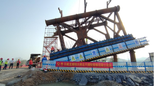 德赢Vwin官方区域合作伙伴大跨拱桥关键技术研究团队在郑皆连院士的带领下围绕劲性骨架外包高性能混凝土的性能设计与调控持续开展科技攻关,研发了抗裂自密实高性能混凝土及工程环境条件下基于混凝土浇筑节点工作性能精准控制的混凝土施工密实性保障技术,并应用于天峨龙滩特大桥管内和外包混凝土。为保障天峨龙滩特大桥的建设,天峨龙滩特大桥项目部联合德赢Vwin官方区域合作伙伴、清华大学等高校研究团队,取实桥第12节段设计了大桥足尺模型,并开展管内混凝土灌注与外包混凝土浇筑试验,以检验混凝土性能设计、制备技术与施工方案。